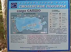 Lake Sapsho (Russian: Сапшо́) is a glacial lake in Demidovsky District of Smolensk Oblast, Russia. It is the largest lake[1][2] (3,04 km2) of the Smolenskoye Poozerye National Park. It is situated northeast of Demidov in the northwestern part of the oblast, near the settlement of Przhevalskoye. Famous 19th century Russian traveller Nikolay Przhevalsky compared the lake with Lake Baikal in miniature.[3][4] The lake is a natural monument.[5] It is connected with the Baltic Sea by the Sapsha, Vasilyevka, Yelsha, and Daugava rivers. There are 4 big and 2 small islands on the lake. There are a lot of tumuli of the Tushumlin culture by Lake Sapsho.[6][7] The flora and fauna of the lake are very diverse. Yet in the beginning of the 20th century there was the industrial fishery.[8] Though now any industry is prohibited here. A lot of species of the flora and fauna of the lake are in the Red Book.[9]