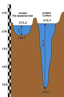 Inflow rivers are the Sapshanka (Russian: Сапшанка) in the south and the Sapsha (Russian: Сапша) in the west. The outflow river is the Sapsha in the east. The Sapsha connects Lake Sapsho and Lake Petrakovskoye (Russian: Петраковское). Both lakes have similar surface elevation. The area of Lake Petrakovskoye is 0.17 km2 (0.066 sq mi). During the period of melting snow in spring and heavy showers in summer Lake Petrakovskoye fills with water faster than Lake Sapsho. Therefore, the Sapsha changes its flow. Usually changing of flow of the Sapsha happens several times a year.