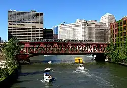 The Lake Street Bridge is a bridge that spans the Chicago River in downtown Chicago, Illinois, United States.[1] The bridge is double-decked, with the lower deck carrying road traffic and pedestrians and the upper deck carrying the Lake Street Elevated, connecting the CTA's Green Line and Pink Line to and from the Loop.