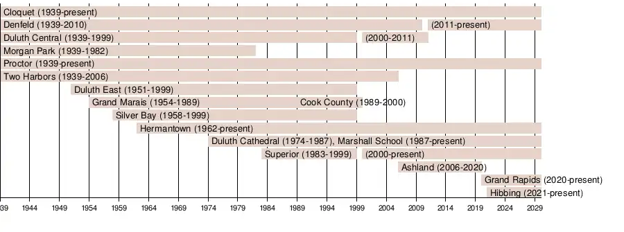 After the conference's name change, the Lake Superior Conference stayed at eleven schools until 1982, when Morgan Park closed its doors[9] and merged into Denfeld.[10] The school became known as Denfeld-Morgan Park for one school year before reverting to the original Denfeld name in 1983. The next year, the Lake Superior Conference accepted its first ever Wisconsin-based member in Superior High School.[11] Membership in the Lake Superior Conference remained stable for sixteen years until in 1999, four schools (Duluth Central, Duluth East, Silver Bay and Superior) left the conference; Silver Bay joined the Polar League and the other three schools became independents.[12] Prior to the exit of these four schools, the members of the conference voted to disband following the 1999-2000 season, citing disparities in enrollment and competition levels.[13] In 2000, the members of the Lake Superior Conference decided not to disband and two schools made their return: Duluth Central and Superior.[14] Their entry into the Lake Superior Conference offset the loss of Cook County to independent status. In 2006, Two Harbors left to join the Polar League and were replaced by Ashland, who had just left the WIAA's Lumberjack Conference.[15] In preparation for the closing of Duluth Central High School, the athletic programs at Central and Denfeld merged in 2010, initially competing under the Central banner before reverting to Denfield after the two schools merged in 2011.[16] Ashland left the Lake Superior Conference to compete as an independent for the 2020-21 school year prior to joining the WIAA's Heart O'North Conference.[17] They were replaced by Grand Rapids, who previously competed as an independent after leaving the Iron Range Conference in 2019.[18] They were followed by Hibbing in 2021, who left the Iron Range in 2020 and brought the Lake Superior Conference to its current tally of eight member schools.[19]