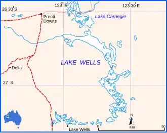 Lake Wells is an ephemeral salt lake in the centre of Western Australia, lying in close proximity to Lake Carnegie.[1] It lies east of Wiluna and is at the southern edge of the Little Sandy Desert and south western border of the Gibson Desert. It also lies to the north west of the Great Central Road and the Great Victoria Desert. Its surface elevation is 436 metres above mean sea-level.[2] Lake Wells has an area of 1895 square kilometres.[3]