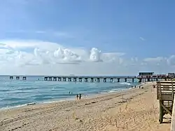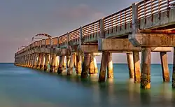 Later in the 2000s decade, the city was hit especially hard by hurricanes Frances and Jeanne in 2004 and Wilma in 2005. Wilma alone destroyed 27 homes and 7 businesses and damaged 2,491 homes and 93 businesses to some degree.[54] Damage to businesses, government properties, and residences combined from Wilma totaled approximately $28.3 million.[55] The William O. Lockhart Municipal Pier, constructed in 1954, suffered significant damage from the hurricanes, especially due to Frances and Jeanne, requiring $3.4 million to be repaired.[50] The pier is home to a tide gauge with a sporadic history, showing an above average rate of sea level rise.[56]