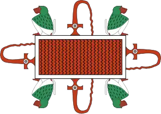 Fiery rivers and lakes in the underworld are mentioned in works such as the Coffin Texts and the Egyptian Book of the Dead. Around their edges sit flaming braziers or baboons. Ra would pass through this lake on his journey through the Duat, renewing his boat.[1][2] Chapter 126 of the Egyptian Book of the Dead is associated with this vignette and the text is addressed to the "four baboons who sit in the prow of the Barque of Re."[3] The lake was one of the dangers encountered on the journey through the Duat and had a dual nature. The baboons who guarded the pool were a force that could refresh and protect the deceased if they knew the correct recitation or destroy them if they did not. In the 21st Dynasty, human figures are depicted within the lakes. These represent enemies of the king or gods and their inclusion within the pools ensures their permanent destruction. In this way, the deceased could avoid meeting a similar fate, and be victorious over the forces of chaos like Ra.[4] Am-heh, whose name means "devourer of millions" or "eater of eternity",[5] is a hunting dog headed god from the underworld who lived in a lake of fire.[6]