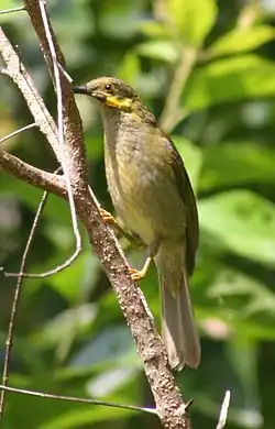 Among land birds, bird species disappeared from Lakeba in prehistoric times, probably after the upland forests were largely cleared away; introduced rats as well as hunting probably also contributed to their demise. Others managed to adapt to the alteration of habitat by humans, though they are generally not as common as on Aiwa where there has been no significant deforestation. For the most part, the avifauna of Lakeba is more similar to that of Samoa and Tonga than to that of the main group of Fiji. Quite commonly seen are the white-rumped swiftlet (Collocalia spodiopygia), Polynesian starling, (Aplonis tabuensis, either the West Fijian subspecies vitiensis or the subspecies tabuensis from the southern Lau group and Tonga), Vanikoro flycatcher (Myiagra vanikorensis), and the slaty monarch (Mayrornis lessoni) which is endemic to Fiji. Two honeyeaters, the endemic orange-breasted myzomela (Myzomela jugularis) and the widespread eastern wattled honeyeater (Foulehaio carunculatus carunculatus), have adapted well to human settlement and are rather common in the coconut plantations. The collared lory (Phigys solitarius), endemic to Fiji in modern times, also frequents this habitat, but is a rather rare species on Lakeba.[2]