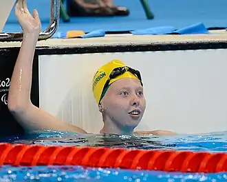 In April 2016, she was selected as part of the national team for the 2016 Summer Paralympics in Rio de Janeiro.[10] She won Australia's first gold medal of the Rio Paralympics in winning the Women's 400m Freestyle S8, she set a new World record, Paralympic record, and Oceania record of 4:40:33, slicing 0.11 seconds of the previous world record time set by her long-time idol, American Jessica Long, who came in second.[11][12] She was a member of the team that won the gold medal in the Women's 4 × 100 m Freestyle Relay 34 points. Three silver medals were won in the Women's 50 m and 100m Freestyle S8 behind Maddison Elliott and the Women's 4 × 100 m Medley Relay 34 points.[13]