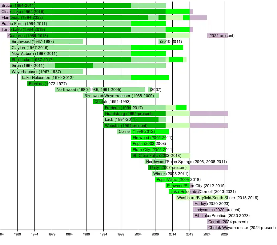 | Balsam Lake | Balsam Lake, WI | Public | N/A | Warriors | 1956[11] | 1957[13] | Closed (merged into Unity) | ||