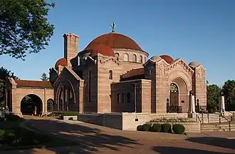 ![]() The Byzantine-styled chapel at Lakewood Cemetery is listed on the National Register of Historic Places | |