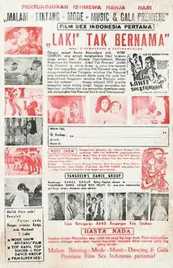 Laki-Laki Tak Bernama was released in 1969.[1] It was advertised as the first Indonesian sex film,[2] as well as "the only National film that is the bravest and biggest . . . . with SEX scenes which are explicit without pulling any punches". The poster featured images of kissing and a woman undressing, and urged viewers to take their girlfriends to see the film.[6]