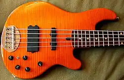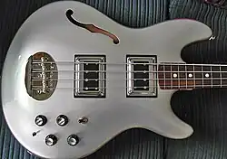 The Lakland Hollowbody is a dual-pickup, hollow-body electric bass guitar designed in conjunction with luthier Michael Tobias.[8][9] The bass is constructed of carved mahogany for the back and sides and of maple for the top and neck. The fingerboard is made of rosewood. Current models are equipped with two of Lakland's Chi-Sonic pickups. The body of the bass is completely hollow with no supporting center block.[10]
