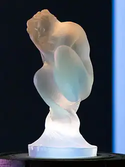 In 1905, Lalique opened a new shop at Place Vendôme which exhibited not only jewellery, but glass works as well.[3][4] It was close to the shop of renowned perfumer François Coty; in 1907, Lalique began producing ornate perfume bottles for Coty.[3][4] The production of glass objects began at his country villa in 1902, and continued there until at least 1912.[3] The first Lalique glassworks opened in 1909 in a rented facility in Combs-la-Ville, which Lalique later purchased in 1913.[3] In December 1912, Lalique hosted an exhibition of Lalique Glass—as his glass would come to be known—at the Place Vendôme shop.[3] During the First World War, the glassworks produced mundane items in support of the war effort.[3] In 1919, work began on a new production facility in Wingen-sur-Moder, which opened in 1921.[3][4] From 1925 to 1931, Lalique produced 29 models of hood ornaments; a mermaid statuette first produced in 1920 was also later sold as a hood ornament.[3] During the 1920s and 1930s, Lalique was amongst the world's most renowned glassmakers.[5]