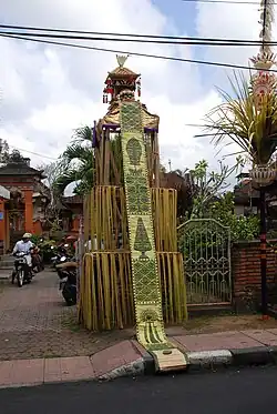 A Lamak is particularly used during the Galungan festival. Before the entrance of each house, a Penjor is erected, a decorated bamboo pole with a small shrine attached. A lamak is hung on this shrine. For the temple festival Odalan, all shrines in the temple are adorned with a lamak. A special case is the elaborately decorated Lamak nganten. This sometimes meter-long "wedding" Lamak is set up in front of houses during the Galungan festival where a wedding took place in the previous year.[1]