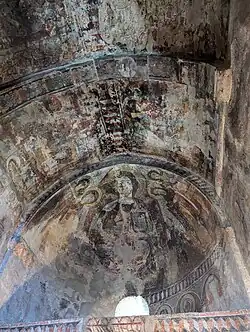 The church is sparsely lit by two windows, one each in the apse and west wall. Both the internal walls and iconostasis are covered with two layers of now faded frescoes, the earlier dated to the 10th century and the second layer painted over in the 13th century. The ambulatory was also frescoed, but only fragments of its 13th-century paintings survive. The exterior bears scarce decorative stonework. The west façade has a cross, sculpted in relief, and a slab with a four-line Georgian inscription, in a mixed khutsuri-mkhedruli script, paleographically dated to the 11th century and mentioning a female donor, named Gurandukht. The church also contains several scratched graffiti, dated from the 10th century into the 18th.[2]