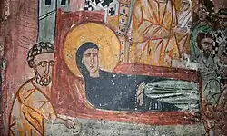 The Lamaria church does not appear in historical records. Judging by its architectural features, the church is dated to the 9th or 10th century.[2] It is dedicated to the Dormition of the Mother of God. "Lamaria" is a name applied by the local Svan people to Mary, mother of Jesus, whose veneration became superimposed on the ancient, pre-Christian cult of Lamaria, a female deity of motherhood and fertility.[3]