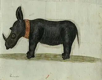 The drawings are so detailed that it is possible that they were meant to serve as designs for copperplate engravings, but no evidence has yet been found that the drawings were thus reproduced in print. It was likely that the drawings were intended to accompany the Costume Book.[15] There are also two drawings of young rhinoceroses from Abyssinia (Ethiopia). These animals were likely destined for the menagerie of the Sultan.[3] While later than Albrecht Dürer's famous woodcut of 1515, these images are among the earliest European depictions of the rhinoceros.[15]
