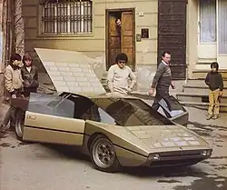 The Bravo was designed to showcase ideas for a replacement for the Urraco. The completely working prototype was built on a Urraco chassis, with the wheelbase shortened by 175mm, and featured a 3.0L 300 hp (224 kW) V8 that powered the rear wheels, undergoing nearly 40,000 miles (64,000 km) of testing before it was placed in the Bertone museum.[1] It was never put into production, but many styling features were inspired by the Countach, including the angular features and the window arrangement.