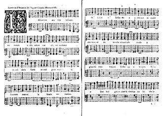 Among other composers who adopted the format and style of Arianna's lament were Francesco Cavalli, whose opera Le nozze di Teti e di Peleo contains three such pieces; Francesco Costa, who included a setting of Rinuccini's text in his madrigal collection Pianto d'Arianna;[49] and Sigismondo d'India, who wrote several laments in the 1620s after the monodic version of Arianna's lament was published in 1623.[50] Monteverdi himself used the expressive lament format in each of his two late operas, Il ritorno d'Ulisse in patria and L'incoronazione di Poppea, for the respective characters of Penelope and Ottavia. In 1641 Monteverdi adapted Arianna's lament into a sacred song with a Latin text "Pianto della Madonna" (incipit: "Iam moriar, mi fili"), which he included in Selva morale e spirituale, the last of his works published during his lifetime.[51]