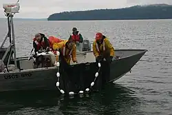 These nets are often utilized on fishing vessels 9 to 18 meters long with 50 to 150 horsepower engines. The nets are hauled in by hand by a team of crewmembers pulling the lateral wings. The fish are removed with a smaller net or a scoop.[1]