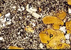 These rocks contain also iron oxides (usually titaniferous), apatite, sometimes sphene, augite, and olivine. The hornblende and biotite are brown or greenish-brown, and as a rule their crystals even when small are very perfect and give the thin section views an easily recognizable character. Green hornblende occurs in some of these rocks. Augite exists as euhedral crystals of pale green color, often zonal and readily weathering. Olivine in the fresh state is rare; it forms rounded, corroded grains; in many cases it is decomposed to green or colorless hornblende in radiating nests (pilite). The plagioclase occurs as small rectangular crystals; orthoclase may have similar shapes or may be fibrous and grouped in sheaf-like aggregates that are narrow in the middle and spread out towards both ends. As all lamprophyres are prone to alteration by weathering a great abundance of secondary minerals is usually found in them; the principal are calcite and other carbonates, limonite, chlorite, quartz and kaolin.[1]