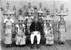 ![]() A Lampung bride and bridegroom in 1987. Both of the couples are of the Sungkai Bungamayang clan. The traditional headgear of the bride, which is called Siger, is commonly used in Lampung weddings. | |