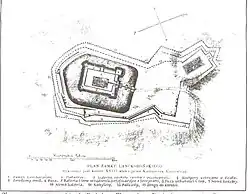 The original stronghold from the Middle Ages had a rectangular shape and had two four-sided corner towers. The rectangular inner courtyard was closed-off from the northwest side of the castle by a living quarters. In the 18th century, after the castle was rebuilt, cannon bastions were located in the corners of the castle, and a drawbridge led to the main gate. In 1770, the Bar Confederation repaired and fortified the castle. With the help of French engineers, external earth fortifications were built including a tick-shaped fort.