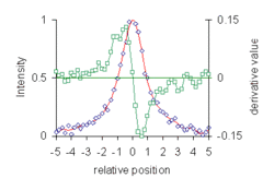 - Location of maxima and minima in experimental data curves. This was the application that first motivated Savitzky.[4] The first derivative of a function is zero at a maximum or minimum. The diagram shows data points belonging to a synthetic Lorentzian curve, with added noise (blue diamonds). Data are plotted on a scale of half width, relative to the peak maximum at zero. The smoothed curve (red line) and 1st derivative (green) were calculated with 7-point cubic Savitzky–Golay filters. Linear interpolation of the first derivative values at positions either side of the zero-crossing gives the position of the peak maximum. 3rd derivatives can also be used for this purpose.