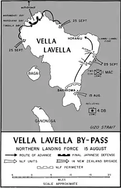 In mid-September, the Americans were relieved by New Zealanders from Major General Harold Barrowclough's 3rd Division.[23] The New Zealand 14th Brigade, consisting of around 3,700 men under Brigadier Leslie Potter,[24] used a series of amphibious operations and cross-country marches to advance through the coastal areas, bounding from bay to bay and then clearing each area with patrols. Two infantry battalions, the 35th and 37th, each allocated eight landing craft, conducted a pincer movement to trap the 600-strong Japanese garrison, while the 30th Infantry Battalion was held in reserve around the main concentration of troops in the south of the island.[25]