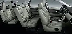 The interior of the Discovery Sport is available in a seven-seat (referred to as five plus two) configuration, with the front row featuring two seats and three seats on the second row.[10][14] The second row seats slide and recline, and fold in a 60:40 configuration, folding forward to allow access to a third row of two seats where fitted.[11][10] The third row of seats are not intended for full-time usage, and are described by Land Rover as being suitable for children up to the age of 15 and occasional adult use.[11][14] They fold flat into the floor of the trunk when not in use. Isofix mounting points for child safety seats are fitted as standard.[4]