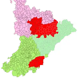 Within the northern part of the Land of Pine Groves, corresponding to the north of the province of Segovia, is the town of Cuéllar, historically linked to forest use and woodwork, self-defined for years as a "Mudejar island in a sea of pine forests".[1] It currently has a significant number of industries dedicated to furniture, and showcases this in contest dedicated to it, framed within the Cuéllar Fair, in which it employs 1,500 square meters for furniture and decoration, and has more than 50,000 visitors.[2][3] During the twentieth century it was one of many Spanish towns dedicated to the production of resin, an industry that has been rehabilitated in the twenty-first century.[4] The patron saint of her Community of village and land, Virgin of El Henar, was proclaimed by Pius XII in 1958 the patron saint of the resin workers of Spain, and canonically crowned in 1971 by Pablo VI.
