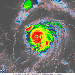 Landfall is distinct from a direct hit. A direct hit is where the core of high winds (or eyewall) comes onshore but the center of the storm may stay offshore. The effects of this may be quite similar to landfall, as this term is used when the radius of maximum wind within a tropical cyclone moves ashore.[4] These effects are high surf, heavy rains that may cause flooding, minor storm surge, coastal erosion, high winds, and possibly severe thunderstorms with tornadoes around the periphery.