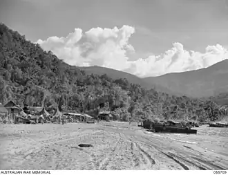 The Papuan Infantry Battalion advanced along the coast ahead of the 162nd Infantry Regiment and reached Lake Salus on 9 July and then pushed on to Tambu Bay. In mid-July, the advancing US troops came up against strong Japanese defenses positioned a ridge overlooking the bay. This ridge, which provided good observation of Tambu Bay, allowing the Japanese to fire artillery down on to the landing beaches, was later named Roosevelt Ridge by the Americans, naming it after Major Archibald Roosevelt, the commander of the 3rd Battalion of the 162nd Infantry Regiment.[29] The Battle of Roosevelt Ridge was subsequently fought between mid-July and mid-August, concurrently with actions to finally capture the village of Mubo and seize Mount Tambu as the Allies sought to draw reinforcements away from Lae, where an amphibious landing was planned for September 1943.[28][30] Further afield, the US also launched the New Georgia Campaign.[23]