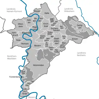 Holzminden (German pronunciation: [hɔltsˈmɪndn̩]) is a district in Lower Saxony, Germany, with the town of Holzminden as its administrative capital. It is bounded by (from the north and clockwise) the districts of Hamelin-Pyrmont, Hildesheim and Northeim, and by the state of North Rhine-Westphalia (districts of Höxter and Lippe).