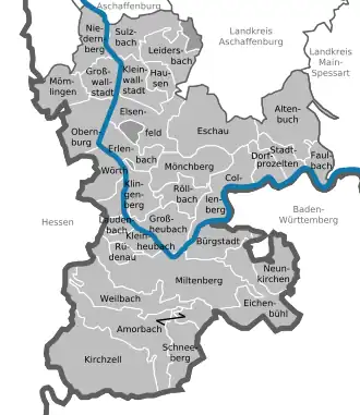 Miltenberg (German: [ˈmɪltn̩ˌbɛʁk] ⓘ) is a Landkreis (district) in Bavaria, Germany. It is bounded by (from the north and clockwise) the city of Aschaffenburg, the districts of Aschaffenburg and Main-Spessart, and the states of Baden-Württemberg (districts of Main-Tauber and Neckar-Odenwald) and Hesse (districts of Odenwaldkreis and Darmstadt-Dieburg).