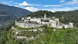 Landskron Castle (German: Burg Landskron, Slovene: Grad Vajškra) is a medieval hill castle northeast of Villach in the state of Carinthia, Austria. Dating to the early 14th century, the castle ruins are located on a rock cone of the Ossiach Tauern range, at an elevation of 658 metres (2,159 ft) above sea level.[1] Today Landskron Castle, its falconry centre conducting regular flying demonstrations, and the nearby macaque enclosure are major tourist destinations.