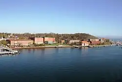 Since 1950, the Landtag convenes in the Landeshaus in Kiel, which was built in 1888 as the Royal Marine Academy.[1] During the Nazi era, the Landeshaus served as the seat of the German Navy's Baltic Sea Command.[1] Up to 1950, the Landtag convened in Lübeck, Flensburg and Eckernförde as well as in Kiel.[1] Since its renovation in 2003, the Landtag sits in a new chamber in the Landeshaus.[1]