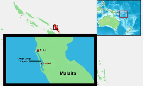 Langa Langa Lagoon or Akwalaafu is a natural lagoon on the West coast of Malaita near the provincial capital Auki within Solomon Islands. The lagoon is 21 km in length and just under 1 km wide. The "lagoon people" or "salt water people" live on small artificial islands built up on sand bars over time where they were forced to flee from the headhunters of mainland Malaita.