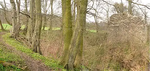 of the medieval Moated castle destroyed in 1626 (see picture at top) only a part of the end wall of a once 36-foot (11 m) high building is left; the other material having been taken to build the various buildings that came and went over the years. Some seven hundred "Fuder" (A medieval unit of about 15 hl volume) of large worked and shaped stones were taken to build part of the 1689 hunting lodge. A later erected church tower with two bells was built, but only the shape of the foundations on the ground gives physical evidence of its existence.