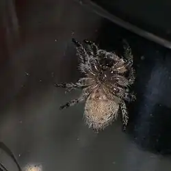 The female is similar in size to the male, with a high carapace between 1.9 and 2.0 mm (0.075 and 0.079 in) in length and 1.5 and 1.6 mm (0.059 and 0.063 in) in width, and an abdomen measuring between 2.1 and 2.2 mm (0.083 and 0.087 in) long and typically 1.8 mm (0.071 in) wide. The carapace is similar in shape to the male, but is brown with a pattern of orange patches. It has a covering of short dense, brown and grey hairs. The chelicerae and labium are similarly brown, but the maxillae are orange. The abdomen is more rounded and dumpy and has a covering of short dense brown hairs. It has an irregular yellow pattern on a brown background on the top while the underside is light yellow. All the spinnerets are light, and the legs have brown rings on them. The pedipalp is also light. The spider has an oval epigyne with two depressions towards the back and a pocket near the epigastric furrow.[4] The seminal ducts are very long and coiled.[12] The internal morphology is more complex than other members of the genus.[13]