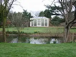 The grounds were landscaped according to the plans of Humphrey Repton.[3] He created the serpentine pond with the bathhouse and gazebo and planted horse chestnuts to mask or frame the mid-18th century stables, to which he added an octagonal cupola. A shrubbery walk with serpentining paths was planted east of the house and a balancing shrubbery belt to the west is probably part of Repton's plan; the Cedar of Lebanon was planted as a central feature of the lawn. By 1805 the gardens were sufficiently advanced to be illustrated in Peacock's Polite Repository.[4]