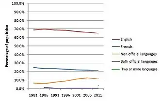 According to the 2011 census, 98.2% of Canadian residents have knowledge of one or both of the country's two official languages,[15] Between 2006 and 2011, the number of persons who reported being able to conduct a conversation in both of Canada's official languages increased by nearly 350,000 to 5.8 million. The bilingualism rate of the Canadian population edged up from 17.4% in 2006 to 17.5% in 2011.[11] This growth of English-French bilingualism in Canada was mainly due to the increased number of Quebecers who reported being able to conduct a conversation in English and French.[11]