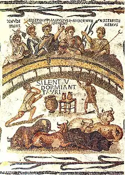The birth certificates and wills of Roman citizens had to be written in Latin until the time of Alexander Severus (reigned 222–235).[33] Illiterate Roman subjects would have someone such as a government scribe (scriba) read or write their official documents for them.[34] Laws and edicts were posted in writing as well as read out.[35] Public art and religious ceremonies were ways to communicate imperial ideology regardless of language spoken or ability to read.[36] An early form of story ballet (pantomimus) was brought to Rome by Greek performers and became popular throughout the multilingual empire in part because it relied on gesture rather than verbal expression.[37]