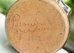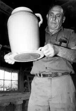Meaders' grandfather, John Milton Meaders, started a pottery business in the community of Mossy Creek, Georgia in 1893, employing his five sons. Son Cheever Meaders took over the business in 1920.[4] Grandson Lanier Meaders continued the traditional ceramic craftsmanship of his forefathers by producing alkaline-glazed stoneware, solely working with a foot-powered treadle wheel and a wood-fired kiln. Like his father, he used materials that were indigenous to the region. His ash glaze was made of sifted ashes from his kiln, Albany slip and regular stoneware clay, and powdered calcium carbonate. Meaders typically created pieces in earth-brown, olive-green and rust-gray similar to those while a young apprentice to his father.[5][6]