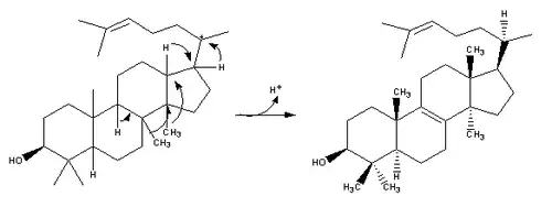 | 2,3-Oxidosqualene is converted to a protosterol cation and finally to lanosterol | ![]() |