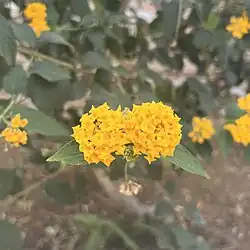 Lantana (/lænˈtɑːnə, -ˈteɪ-/)[2] is a genus of about 150 species of perennial flowering plants in the verbena family, Verbenaceae. They are native to tropical regions of the Americas and Africa but exist as an introduced species in numerous areas, especially in the Australian-Pacific region, South and Northeastern part of India. The genus includes both herbaceous plants and shrubs growing to 0.5–2 m (1.6–6.6 ft) tall. Their common names are shrub verbenas or lantanas. The generic name originated in Late Latin, where it refers to the unrelated Viburnum lantana.[3]