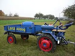 From 1951-57, Lanz manufactured a rear-engined derivative of the Bulldog,[2] known as the Lanz Alldog.[3] This had a large bed over the front wheels, for transporting cargo over ground unsuitable for a trailer.[4] Tractors of this type were popular among Israeli farmers during the 1950s, especially on hilly and mountainous terrain.[5]