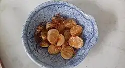 The Lao eggplant (Lao: ໝາກເຂືອ, pronounced [mȁːk kʰɯ̌a̯]), also known as Lao aubergine, is a local variety of eggplant found in Laos and used primarily in Lao cuisine. Research indicates Laos to be home to a wide diversity of eggplant landraces with variation in fruit shape, color, and the presence or absence of spines.[1] Common cultivar types in Laos are Lao Green Stripe, Lao Purple Stripe, Lao Lavender, and Lao White.[2] They are usually round and roughly the size of a golf ball.