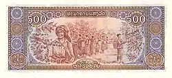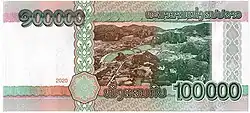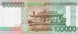 The Bank of Laos governor announced on January 25, 2012, that the Bank of Laos would issue 100,000 Kip banknotes as a regular issue on February 1, 2012 (but dated 2011) to encourage Lao people to use the national currency instead of U.S. dollars and Thai baht.[13][14][15] As of 2019, the ₭500 note is the smallest one commonly in circulation.