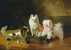 The Phalène is the earliest form of the Papillon; the appearance of the erect-eared variety was not documented until the 16th century, by which time the Phalène had been portrayed in numerous paintings, particularly in portraits of the wealthy by Old Masters and their students. Belgium, France, Spain, and Italy have all been credited with the creation or development of Butterfly Dogs. The dog breed appeared often in portraits of European royalty painted by the Old Masters, which indicates that this breed was favored as lapdogs as early as the 13th century. This breed is no longer considered a lap dog. This sportive and intelligent breed is used in various activities, such as agility, obe-rythme, cani-cross, etc. Its intelligence is among the best of all dog breeds (8/132), which places it before some other breeds regarded as highly intelligent, such as the Rottweiler and the Aussie.