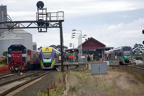 In 1973, a signal panel was provided at the station, and in 1981, it relocated into the station building.[4][2] It was abolished in January 2006.[5] No.2 road (loop siding) was also extended in 1973, providing a crossing loop.[4][2] The loop siding is generally used by trains serving the Avalon Airshow, which terminate at Lara.