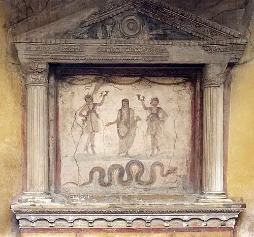 The symbolism and meanings conveyed by lararia and their contents are much disputed. Lararia usually held images of one or more bearded or crested snakes, which are presumed to represent the family genius, fertility, or generative or procreative power. Lararia almost always contain the central painted image of a togate man, head covered by a fold of his toga, as if at worship or fulfilling his domestic priestly duties, carrying or offering a patera, or sacrificial vessel. This figure is usually said to represent the head of the household, or paterfamilias. He is symmetrically flanked by two painted or sculpted Lares. The Lar Familiaris is a more-or-less standard image, like other lares he is young, slender, clad in high boots, a short tunic, and a hitched undergarment.[4] Garlands adorn his head, and he is lithe, graceful, and nimble. He stands on tiptoe, and offers a rhyton, patera, or both; or sometimes, a cornucopia. The Lar's statue could be moved from the lararium to wherever its presence was needed. It could be placed on a dining table during feasts or be a witness at weddings and other important family events. Brides were expected to give a coin to the Lares of the crossroads (Lares Compitalicii) of their new neighbourhood, and one to the lar of their new home.
