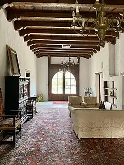 By the 1930s the building had been stuccoed in lime plaster. When the building was reconstructed in the mid-1930s, the Bolsius trio used the adobe shell which lent itself to the Pueblo Revival idiom. Having spent time in New Mexico they took inspiration from the romanticized architectural traditions of the southwest and infused a high artistic style into the project which elevated it into an extraordinary example of regional design. As part of the transformation, they continued the lime plaster stucco treatment which softened and rounded edges and installed beautifully hand-carved wood doors, hand-carved corbels, vigas, and lintels. They used the extant territorial windows painted blue and enclosed the zaguán into a sala (living room). As part of the reconstruction, they used numerous conventions typical of Spanish colonial and pueblo revival architecture in the Southwest including adding alacena (cupboards built into an interior adobe wall), bancos (adobe benches built at the base of a wall), nichos (niche in interior adobe wall used for display of santos and artworks) and redesigned and installed fogon (comer fireplaces).[5] As part of the redesign they retained the original south facade volume and basic detailing including the retention of the south-facing portion of original portál. A wall was added connecting the main house with the gatehouse punctuated by a decorative carved gate topped with an espadana and bell.